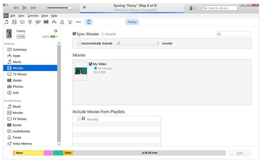 6.最后,单击“应用”即可开始将所选视频同步到iPhone。