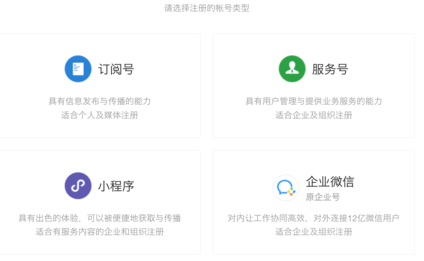 1、首先在浏览器上搜索并登录微信公众号平台,然后右上方点击“立即注册”。2、随后选择注册帐号类型,分别是微信订阅号、微信服务号、微信小程序、微信企业版,大家需要根据自身的需求进行选择。