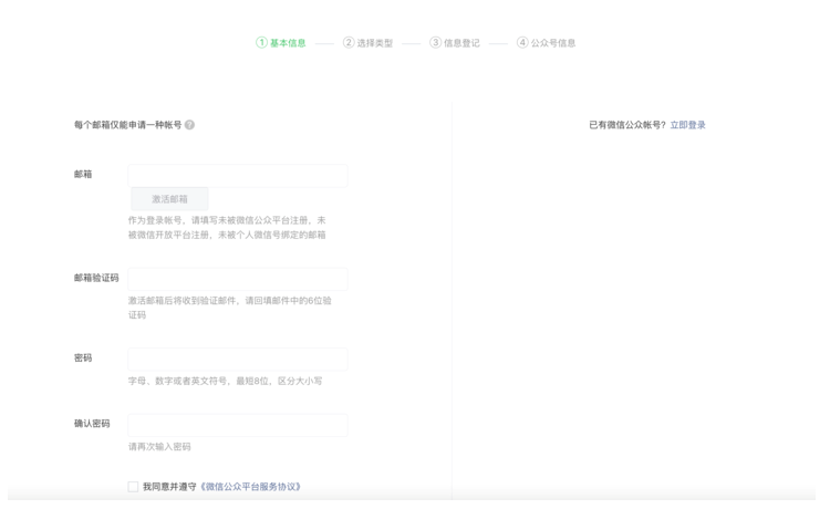 3、选择完成后,接着填写邮箱,然后登录邮箱中查看激活邮件,然后填写邮箱验证码激活。4、随后是信息填写环节,根据提示依次填写相应信息后即可创建微信公众号。