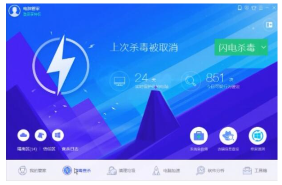 1、首先我们打开电脑管家,然后点击最下面的病毒查杀