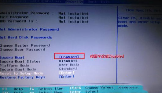 1、开机一直按F2或(FN+F2)进入BIOS,按→方向键切换到Security,选择Secure Boot回车设置成Disabled。