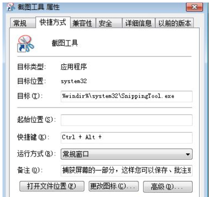3、在桌面上右击“截图工具”的图标,选择“属性”,在“截图工具属性”对话框中,点击“快捷方式”选项卡,再点击这个选项卡页面上“快捷键”设置的位置,默认会出现“Ctrl+Alt+”,可以在后面加上任意字母键或数字键,如“Ctrl+Alt+S”,点击应用、确定。