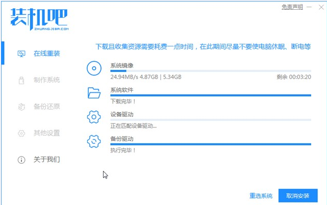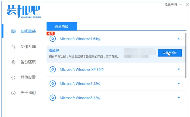 1、安装好装机吧一键重装系统软件并打开,下载安装win7的64位系统