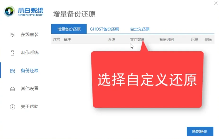 3、选择【备份还原】后再选择【自定义还原】,点击下一步。