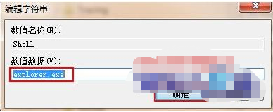 5、然后在界面的右边找到“shell“项,双击打开它,将”数值数据“为”explorer.exe“,点击确定,关闭注册表即可。