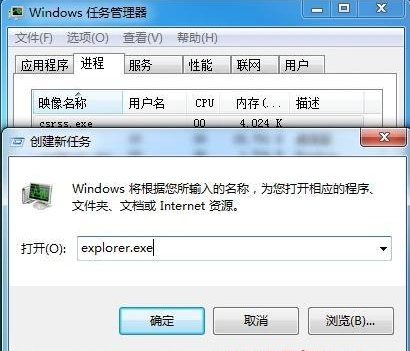 1、打开任务管理器,新建任务,输入explore.exe;