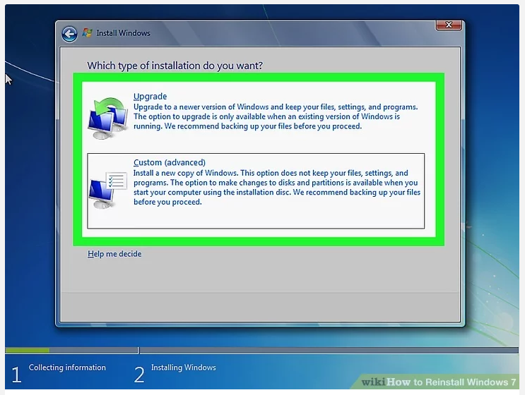 5、在引导过程之后,您将看到一个选择:升级或自定义安装。选择自定义安装选项,因为这是您将用硬盘驱动器进行重新安装的选项。