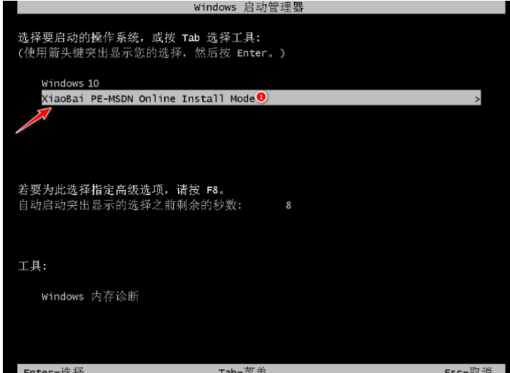 4、电脑重启之后进入了开机选项页面,选择xiaobai-pe系统进入。