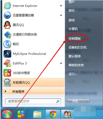 1、单击电脑左下角的“开始”,在弹出的开始菜单中选择“控制面板”打开即可。