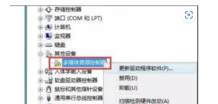 3、小图标有感叹号的话,那就是声卡驱动有问题,鼠标右键选中后更新或者重新卸载安装新驱动即可。