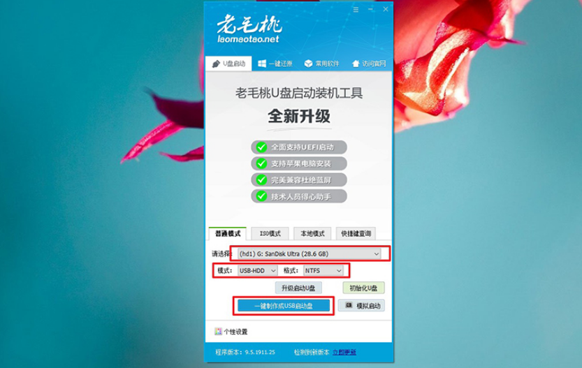 1、 准备一个8G左右的空白U盘接入电脑,下载安装老毛桃U盘启动盘制作工具打开,一键制作U盘启动盘。制作完毕后,下载win7镜像保存在U盘启动盘。