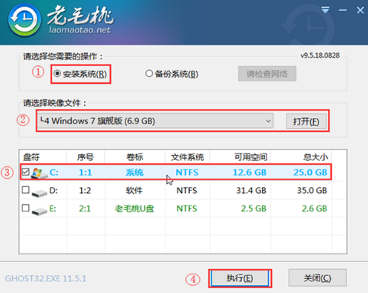 3、 选中win7系统镜像,安装在C盘,点击“执行”即可。