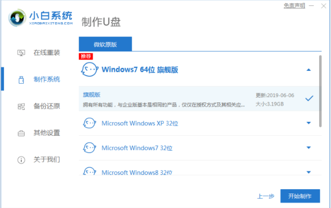 2、进入系统选择页面之后,选择我们需要安装的win7系统,点击“开始制作”。