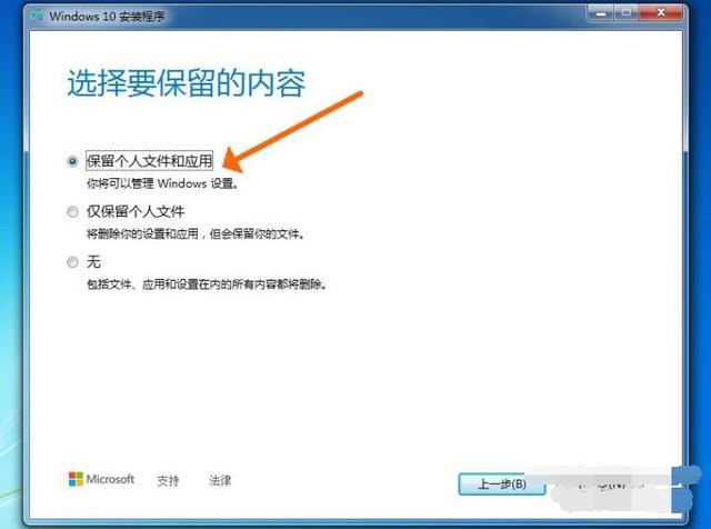 6、在“选择要保留的内容”处点选“保留个人文件和应用”,这样在Win7系统中的应用和文件数据在Win10安装完成后就都会完整保留下来了