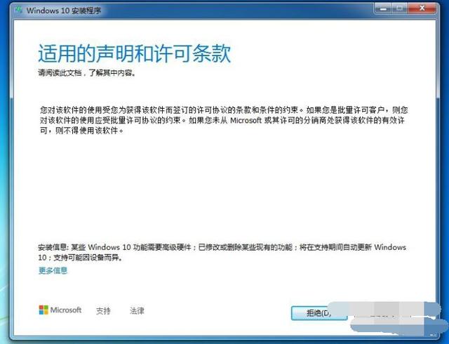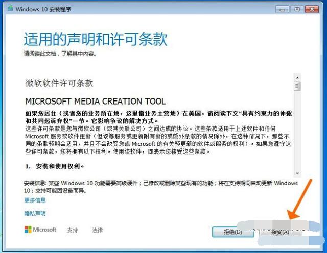 2、下载完成后,运行“Windows 10安装程序”,出现声明和许可条款,点击接受。