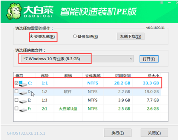 4、点击打开桌面装机工具,选择“安装系统”,“映像文件”选择已下载的win7镜像系统,安装在“C盘”并点击“执行”进入下一步即可。