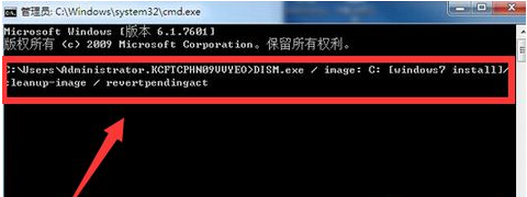 3、在命令提示符窗口中输入:DISM.exe / image: C: [windows7 install]/ cleanup-image / revertpendingact并按下回车运行。运行完毕之后,退出重新启动电脑即可修复。