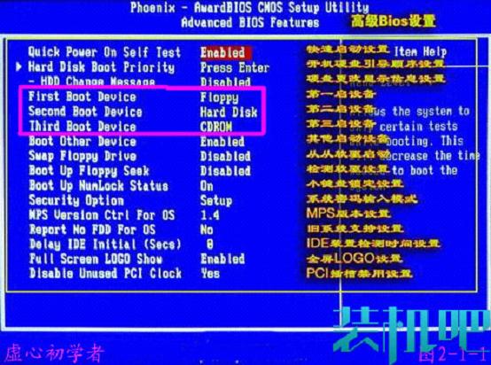 在这个界面中,有First Boot Device 、 Second Boot Device 、 Third Boot Device三项,这三项就是设置启动设备的启动顺序的。将光标移到First Boot Device上。按回车键,出现可供选择的启动设备界面: