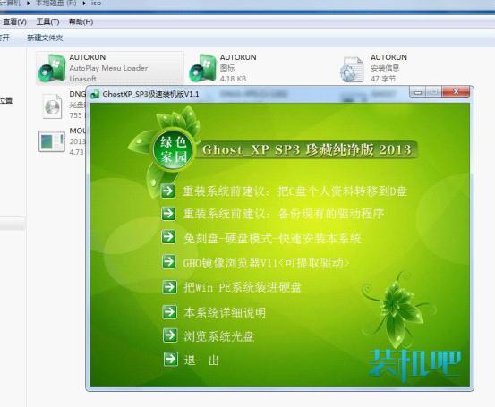 去网上下载个系统,要ISO文件的唷,解压放在其他盘里(不能是C盘),在这个文件夹里有一个文件名为“autorun.exe”,运行这个文件,看一下就会懂的。具体也不多说了,请听下集讲说。