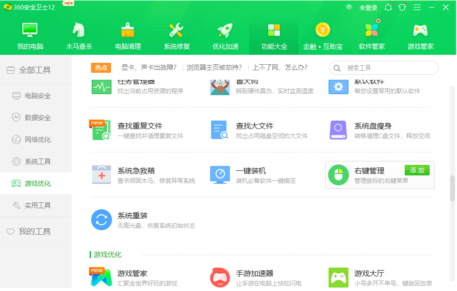 1.打开360安全卫士,点击功能大全,找到系统重新安装,然后添加,如下图所示:(也可以直接搜索下载360重新安装的系统大师)