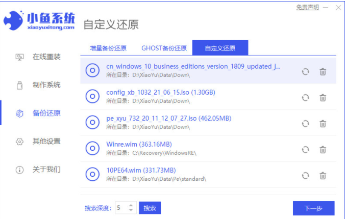1.下载安装小鱼一键重装系统软件,打开小鱼选择备份恢复,然后点击自定义恢复,如图所示: