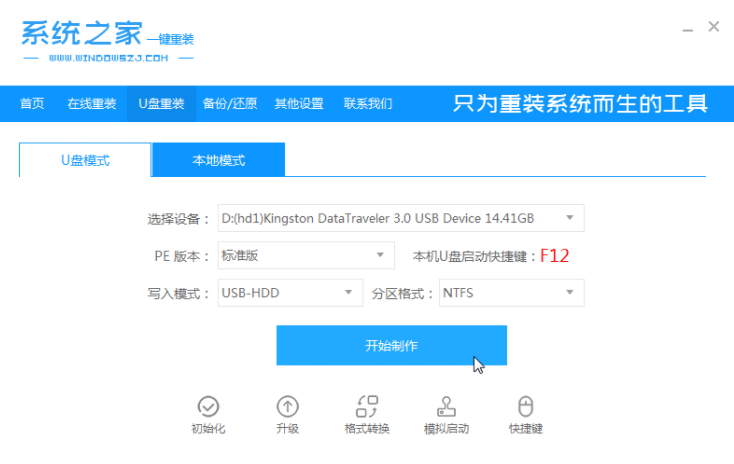 1.首先在一台可用的电脑上下载安装系统之家一键重装系统工具,插入超过8g的空u盘,选择u盘模式开始制作。