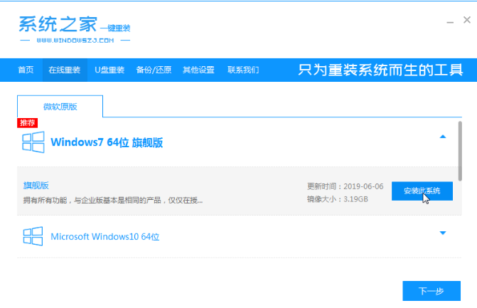 1、第一步我们进入到系统桌面当中,找到系统之家重装系统软件的快捷方式,进入到首页当中,选择想安装的系统,单击右侧出现的安装即可。
