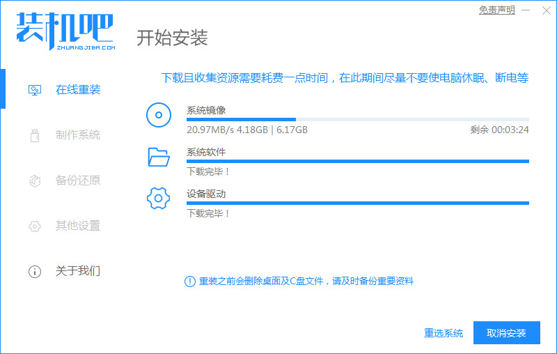 打开装机吧一键重装系统,选择win7旗舰版系统进行下载,等待系统重启安装。