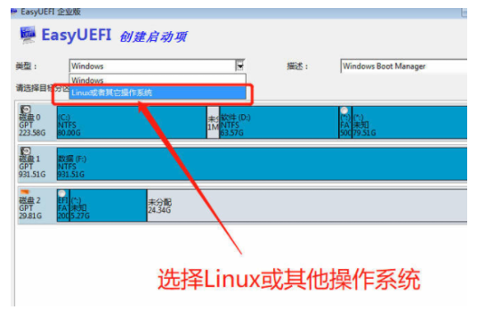 3、出现窗口中,类型将Windows改成Linux或其他操作系统,根据图示操作即可