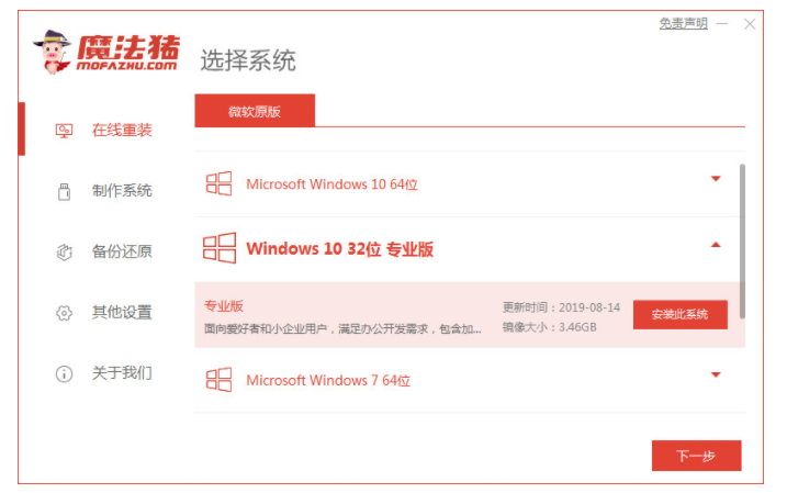 1、下载并运行魔法猪系统重装大师,选择要下载的系统,点击右侧的安装。