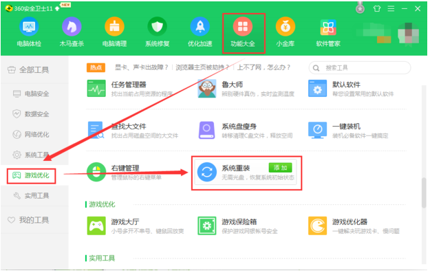 1、首先打开360安全卫士的功能大全(也可以直接浏览器搜索“360系统重装大师”进入官网直接下载),再点击左边的系统工具中的系统重装下载安装好。