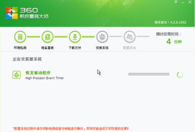 5、至此系统实际已经安装完成,360系统重装大师在新版本中增加了配置系统环节,这时会对电脑驱动运行情况进行扫描,以确保安装好的系统中驱动都能正常运行。