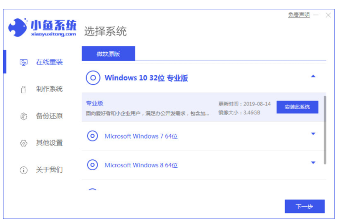 1、打开小鱼装机工具软件,选择需要的系统点击安装。