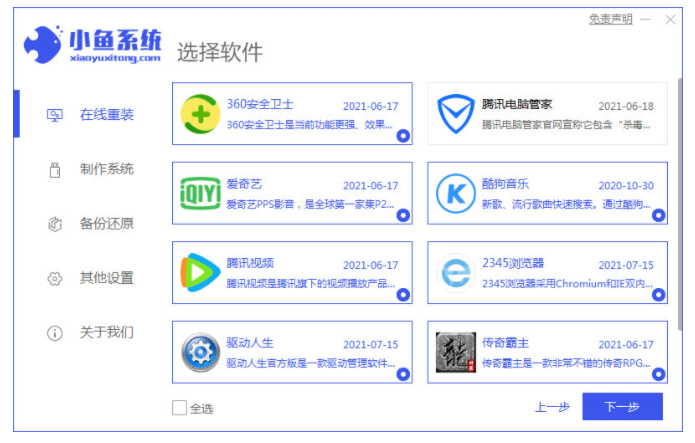 1、下载并打开小鱼装机工具软件,选择现在重装系统,选择要重装的系统。
