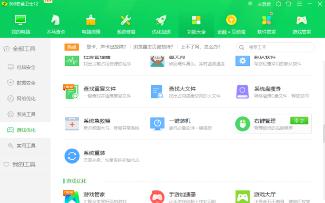 1.打开360安全卫士,找到功能大全,点击系统重装,然后添加。