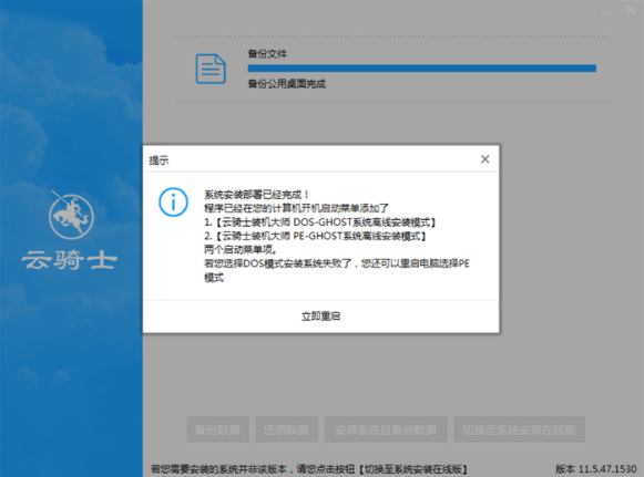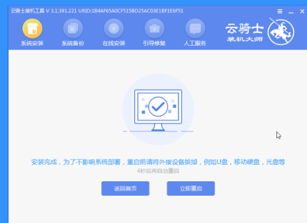 步骤7:系统安装程序部署完毕并准备系统重装工作,点击“立即重启“后,电脑进入开机状态。