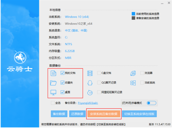 步骤6:把我的文档 收藏夹 桌面上的数据勾选备份下,方便重装后使用,选择点击【安装系统】。