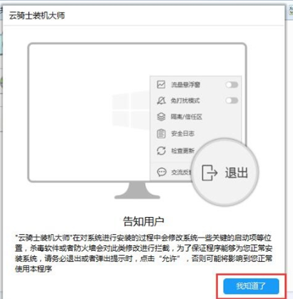 步骤5:弹出云骑士装机大师温馨提示用户关闭一切杀毒软件来进行下面操作,点击下面“我知道了”。