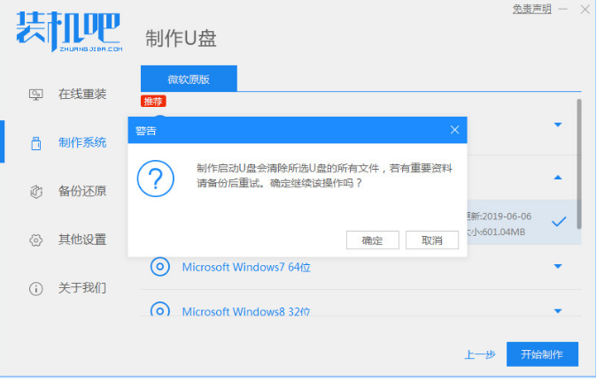 1、下载安装装机吧一键重装系统软件并打开。准备一个8GB以上的U盘。选择制作系统,在制作U盘中选择自己的U盘,其它参数默认点击开始制作。