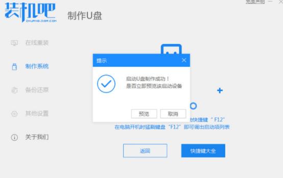 5、u盘启动盘制作完成时,我们可以选择预览点击进入bios设置的快捷键,也可以点击取消。