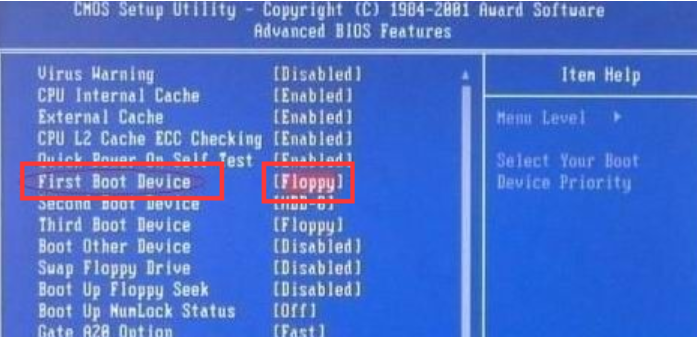 3.选择启动项,找到“boot”,找“first boot”这个选项,再选择“cd-rom”,这就是光驱啦;