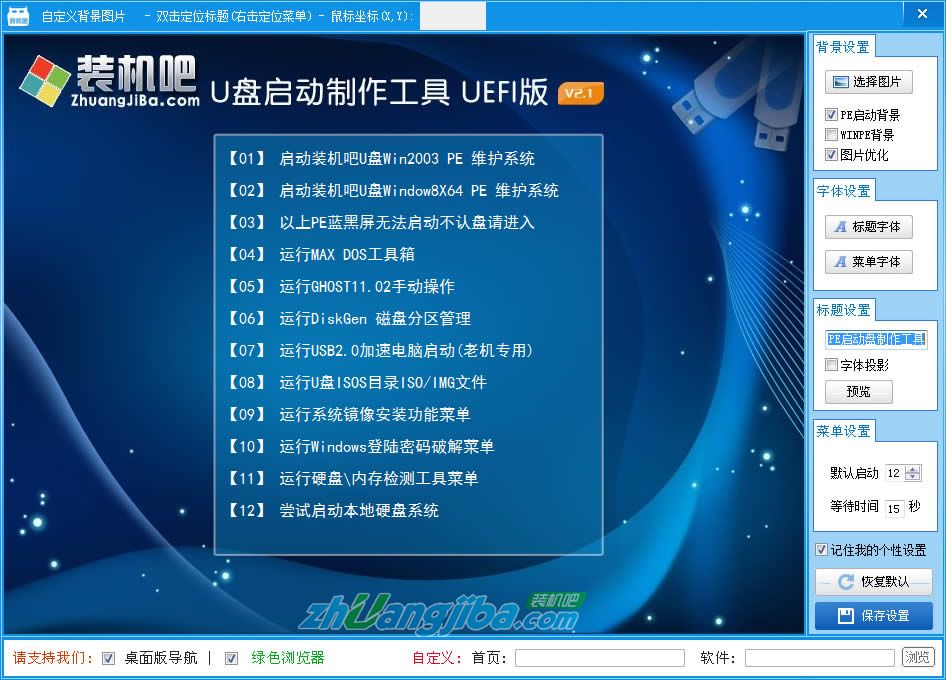 装机吧U盘启动工具专业版新增获取验证码自定义首页、本地软件添加,此乃装机人员的必备首选;特色ISO模块一键制作,进一步挖掘U盘的潜在价值;内置DIY设置全新优化,让个性来的更干脆些;最高支持WIN8PE等多个PE启动,可兼容更多新老硬件!