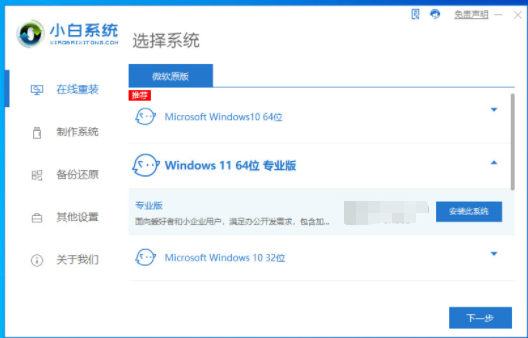 2、在‘在线重装’界面选择‘windows11 64位 专业版’后,点击‘安装此系统’。