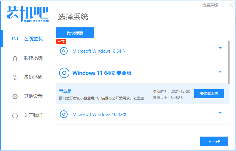 打开装机吧一键重装系统工具,选择需要的win11系统安装;