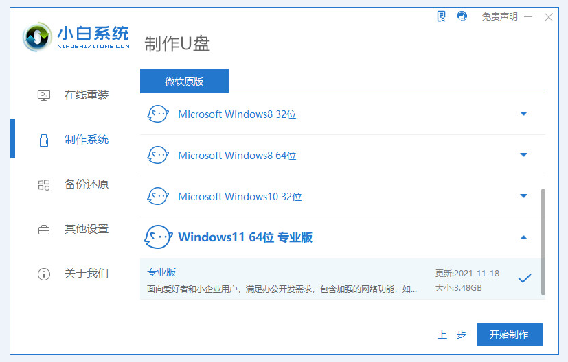 2、选择windows11 64位,然后点击开始制作。
