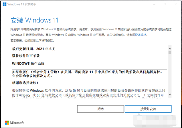 3、等待工具下载安装到电脑后,打开“Windows11安装助手”,点击“接受并安装”协议进入。